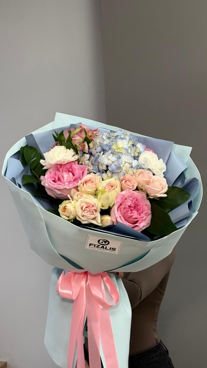 Состав: Гортензия, роза кустовая, роза одноголовая, альстромерия, зелень,упаковка, лента.