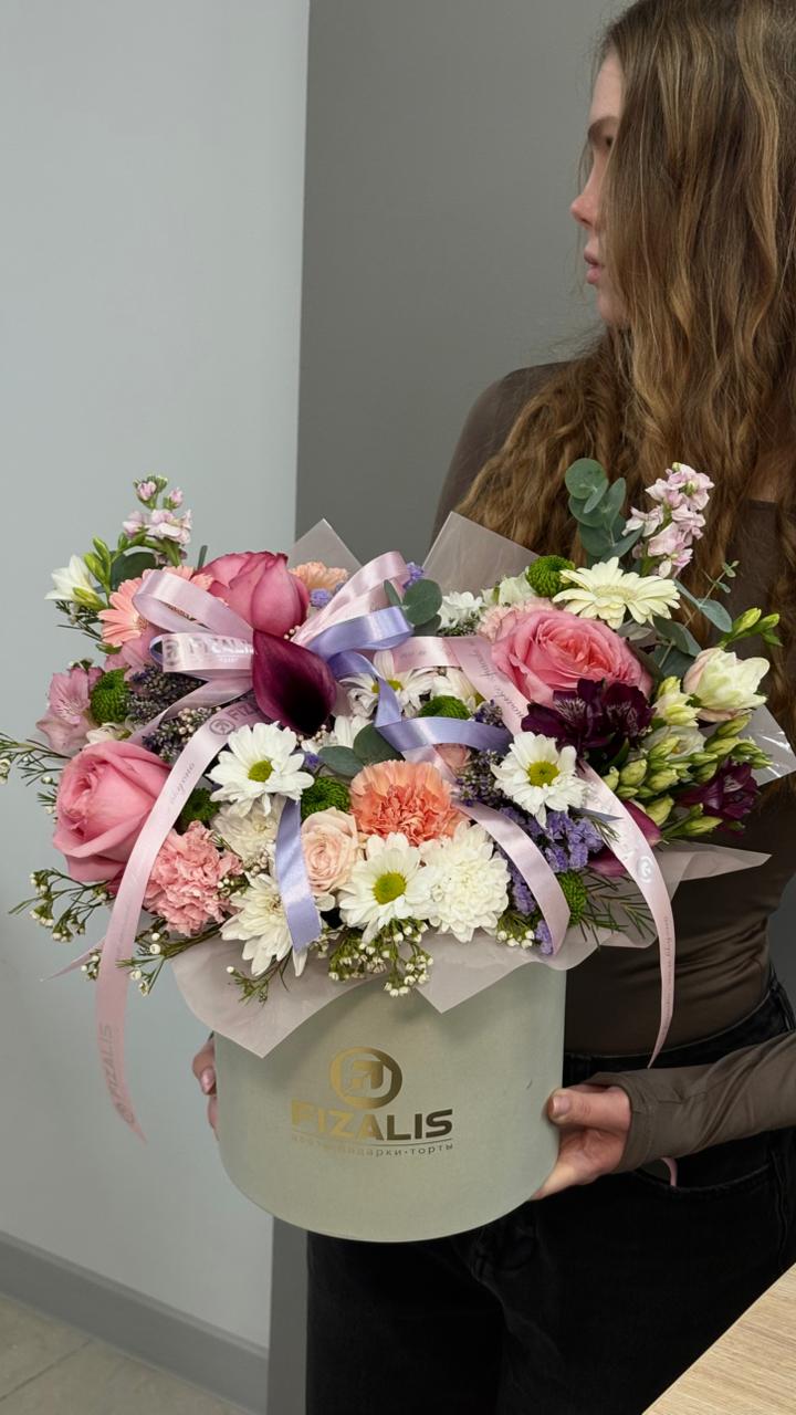 Мы делаем цветочные композиции только в наших брендированных коробках. Также можете добавить брендированную ленту при выборе букета.