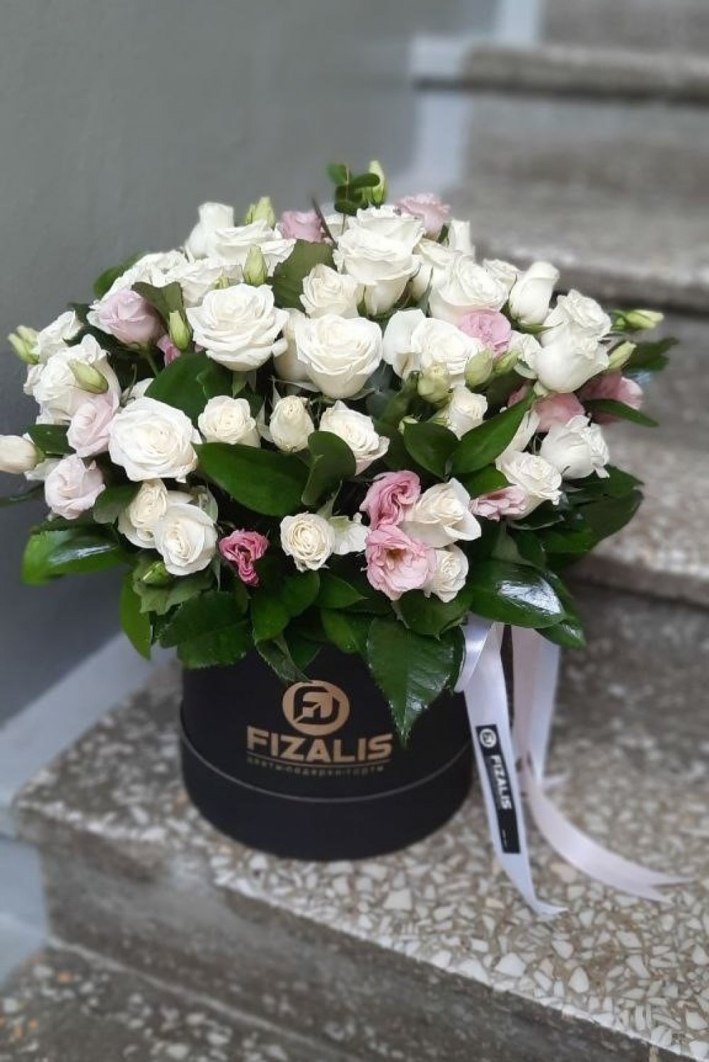 Состав: Кустовая роза, Лизиантус, зелень, коробка, оазис, лента.