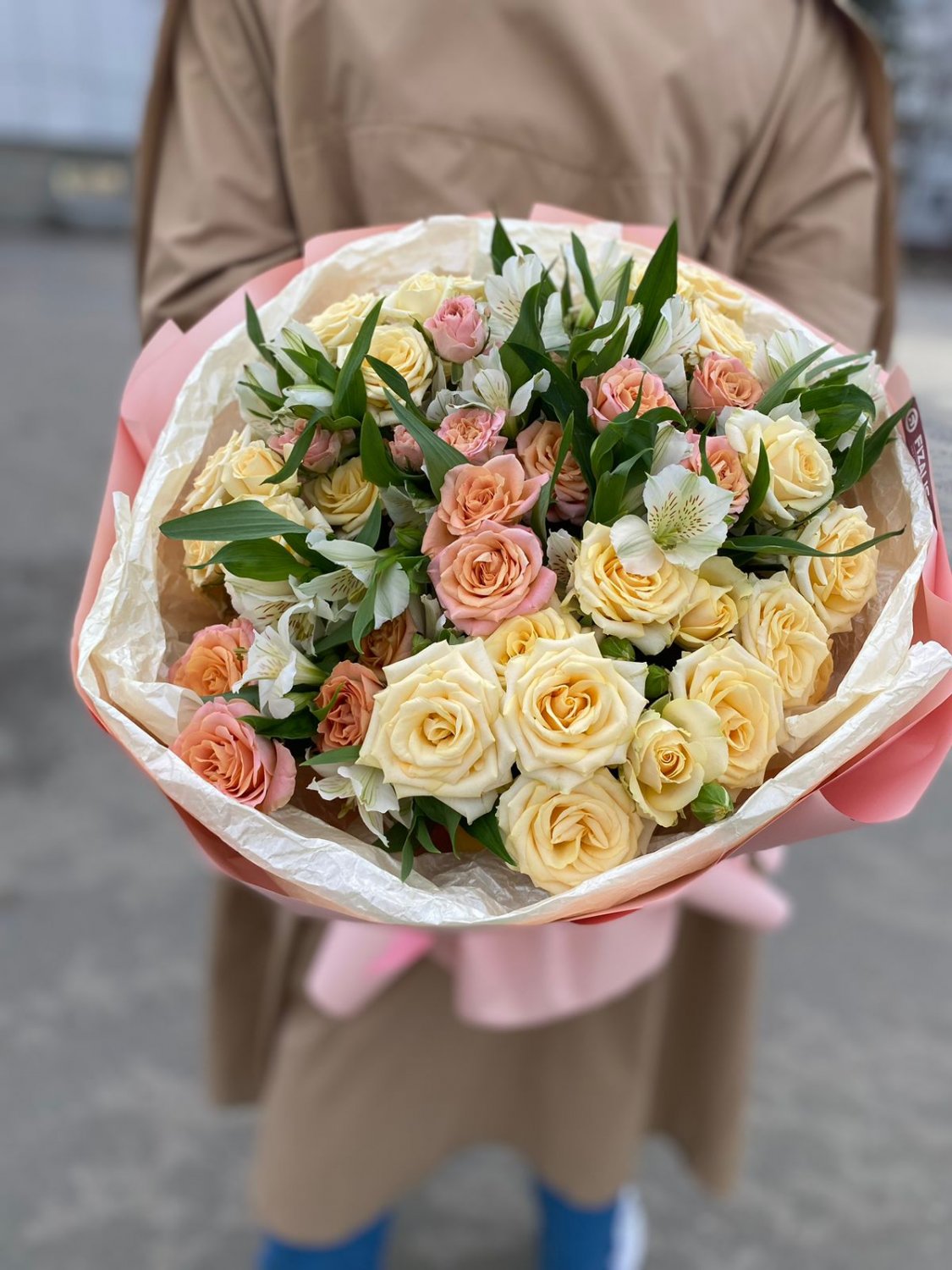 Цены на цветы зависят от поставок. На сайте указана средняя стоимость, поэтому менеджер уточняет бюджет перед сборкой букета.