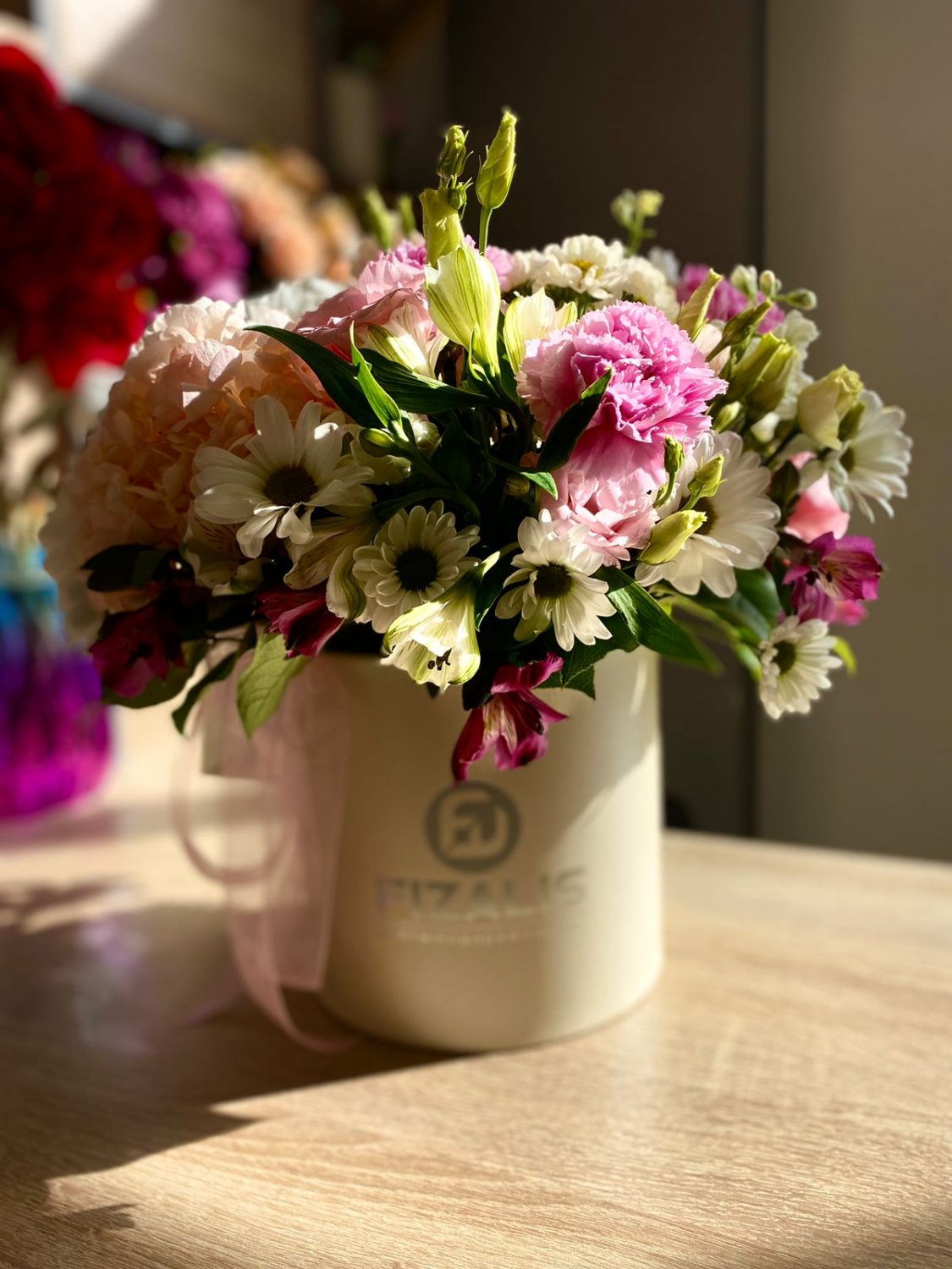Мы делаем цветочные композиции только в наших брендированных коробках. Также можете добавить брендированную ленту при выборе букета.