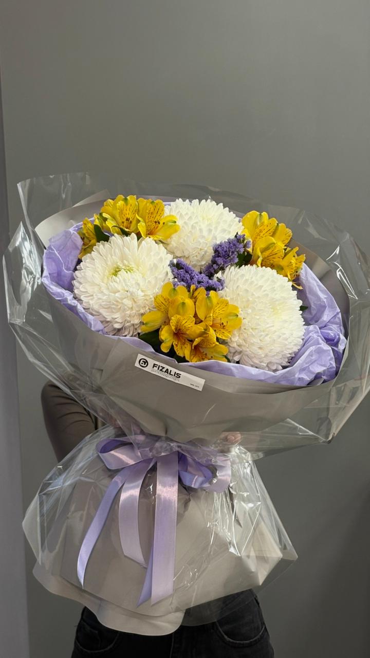 Состав: Альстромерия, Хризантема одноголовая, Статица, упаковка, лента.