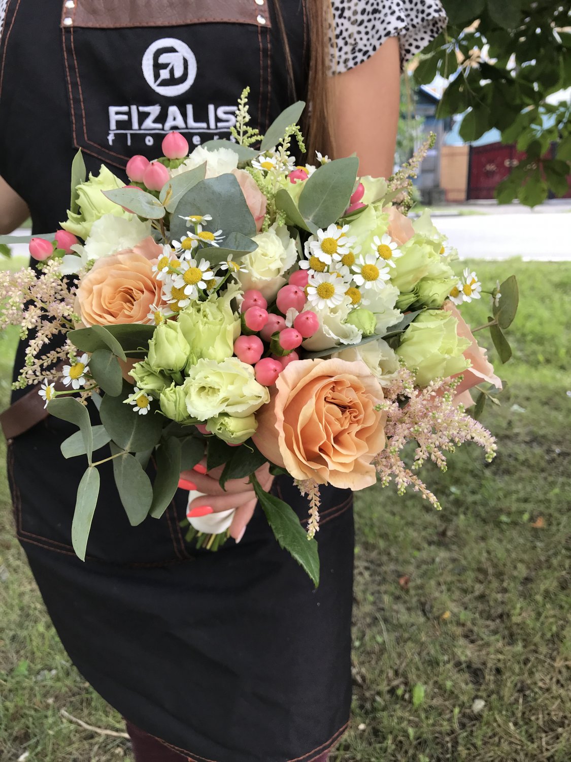 Заказать свадебный букет невесты в Гомеле — это доверить создание одного из главных аксессуаров вашего торжества опытным флористам салона Fizalis. Этот нежный и романтичный букет составлен из свежайших цветов, которые символизируют любовь и счастье: классические розы, изящный лизиантус (эустома), воздушный танацетум и астильба, ягоды гиперикума и веточки эвкалипта для изысканного аромата и естественной текстуры.