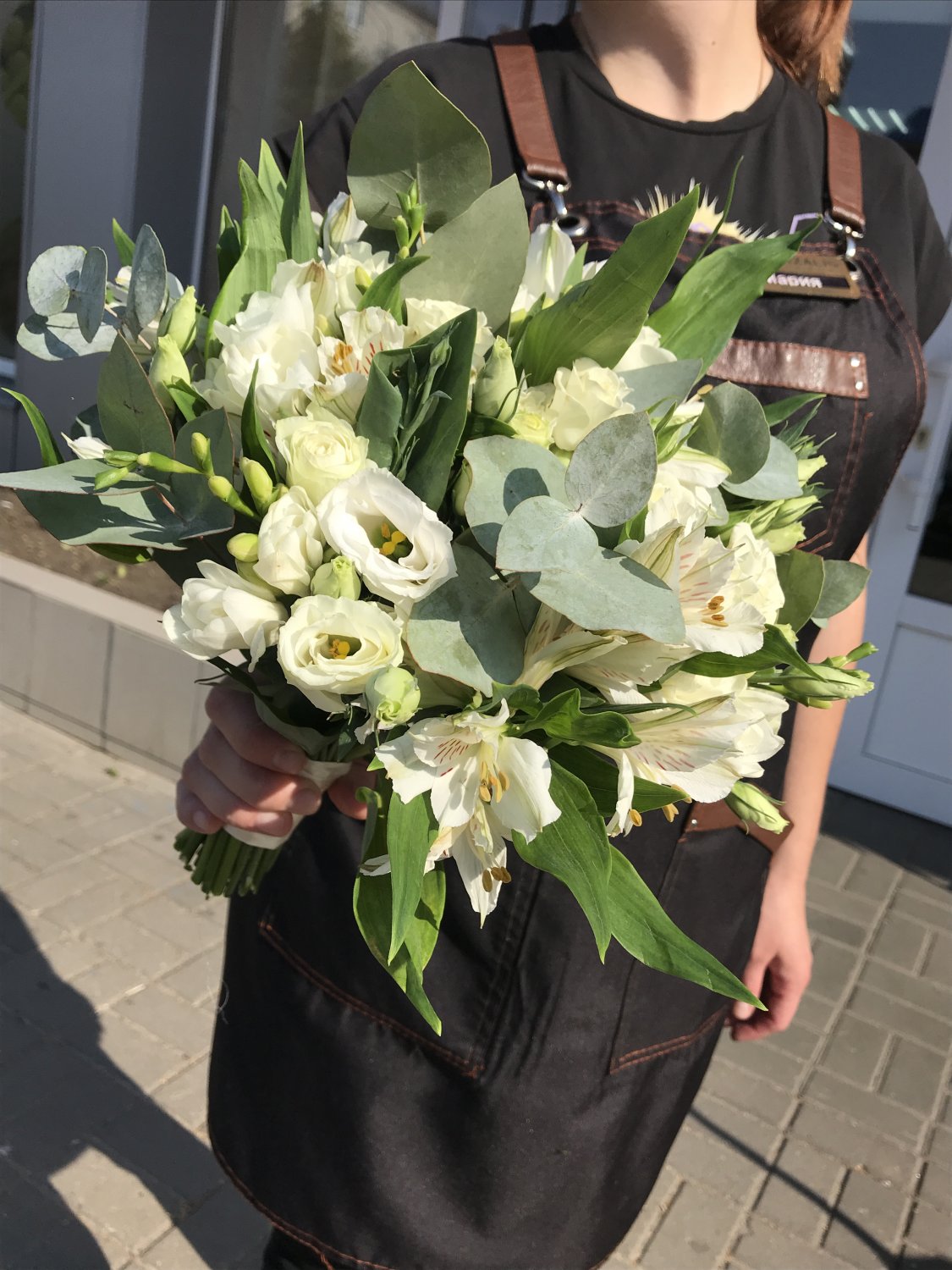 Состав: Лизиантус, Альстромерия, Фрезия, Эвкалипт, лента.
