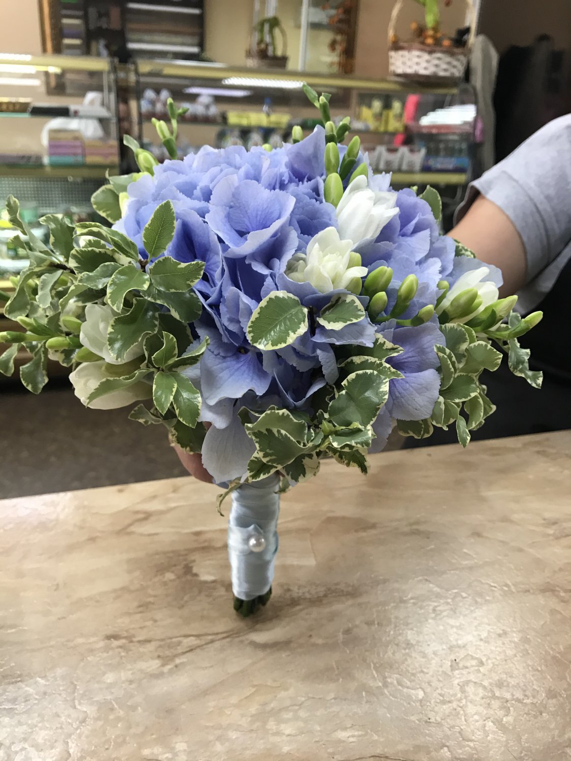 Состав: Фрезия, Гортензия, Питоспорум, лента. Бутоньерка и лепестки в подарок.