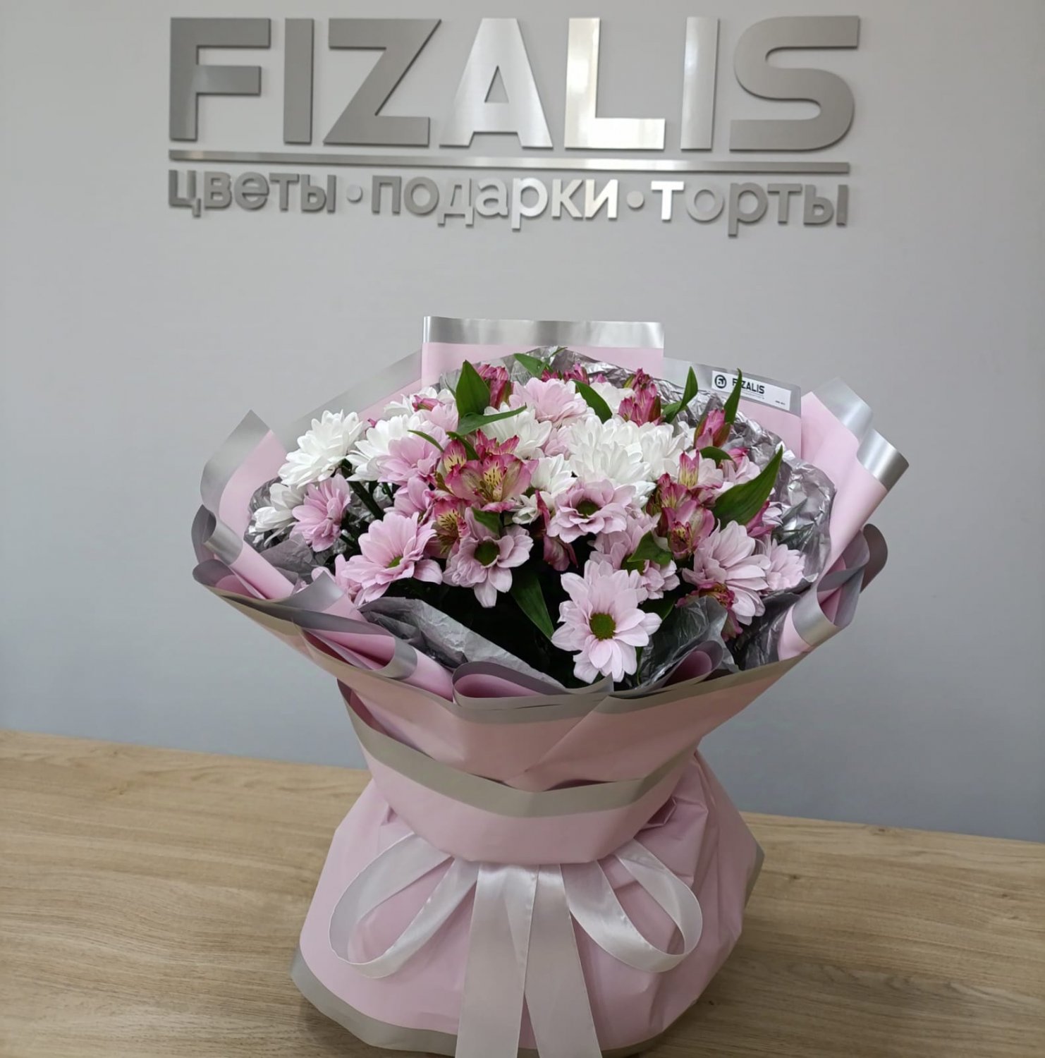 Мы делаем цветочные композиции только в наших брендированных коробках. Также можете добавить брендированную ленту при выборе букета.