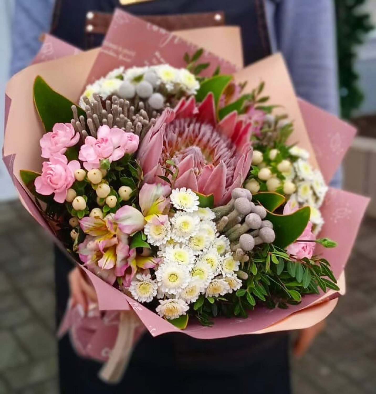 Состав: Протея, Альстромерия, Хризантема, Гвоздика кустовая, Бруния, Гиперикум, фисташка, упаковка, лента.