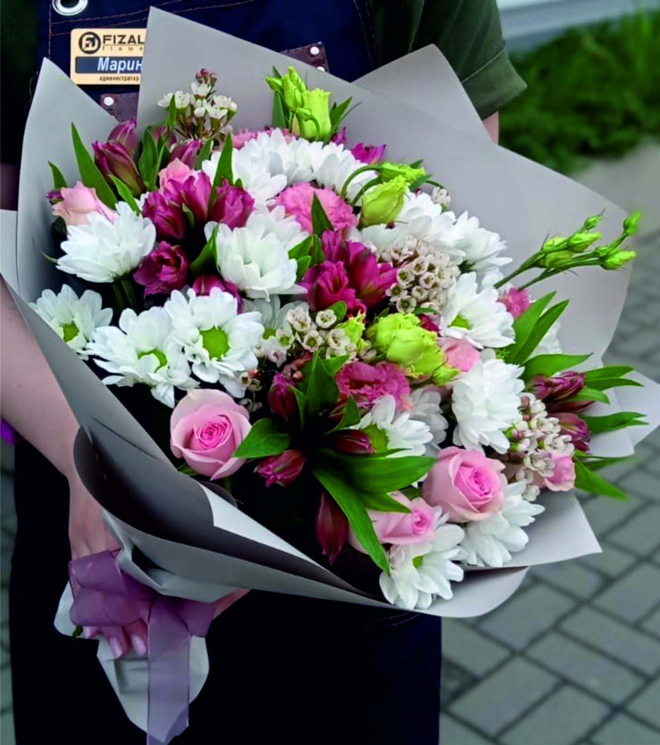 Состав: Хризантема, Альстромерия, Роза Кения, Хамелациум, упаковка, лента.