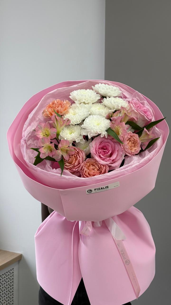 Состав: Хризантема кустовая, Роза, Альстромерия, упаковка.
