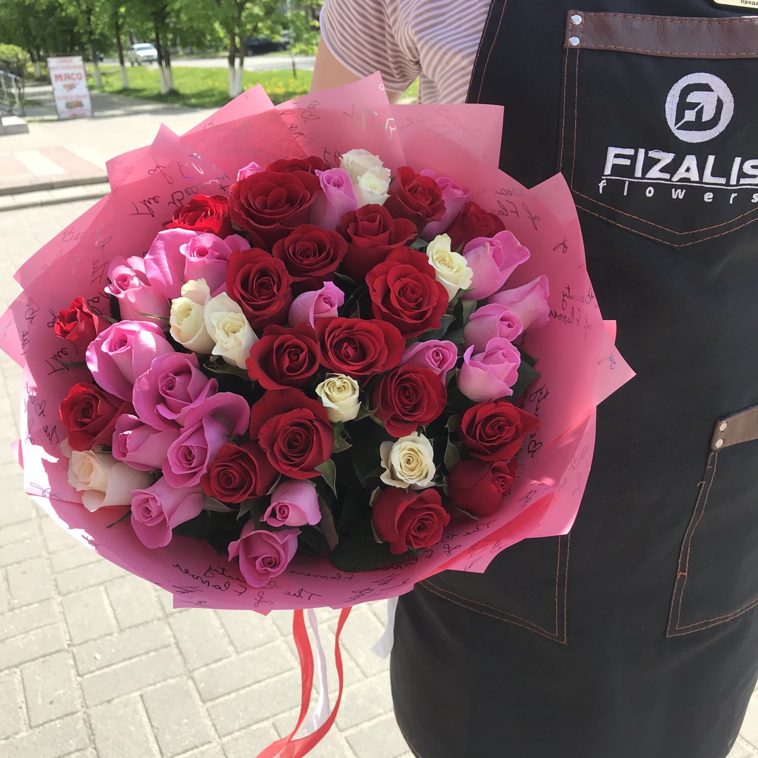 Цены на цветы зависят от поставок. На сайте указана средняя стоимость, поэтому менеджер уточняет бюджет перед сборкой букета.
