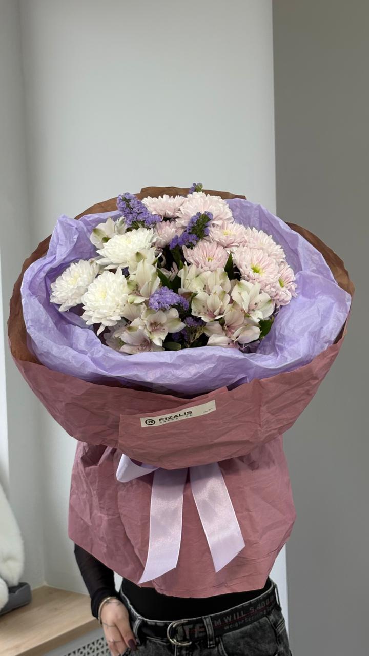 Состав: Статица, хризантема кустовая, альстромерия, упаковка.