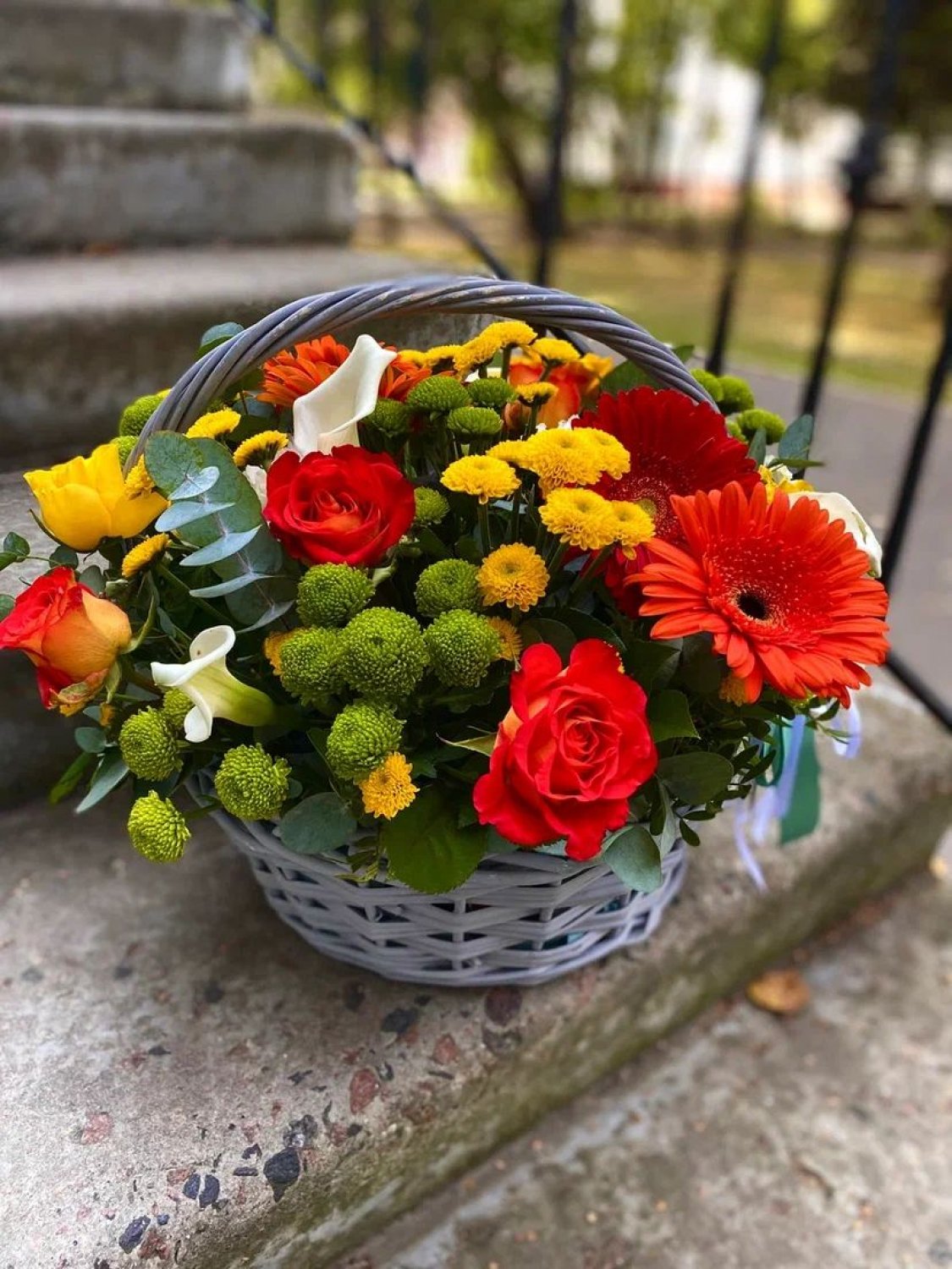 Состав: декоративная корзина, флористическая губка, хризантема кустовая, роза, гербера, зелень.