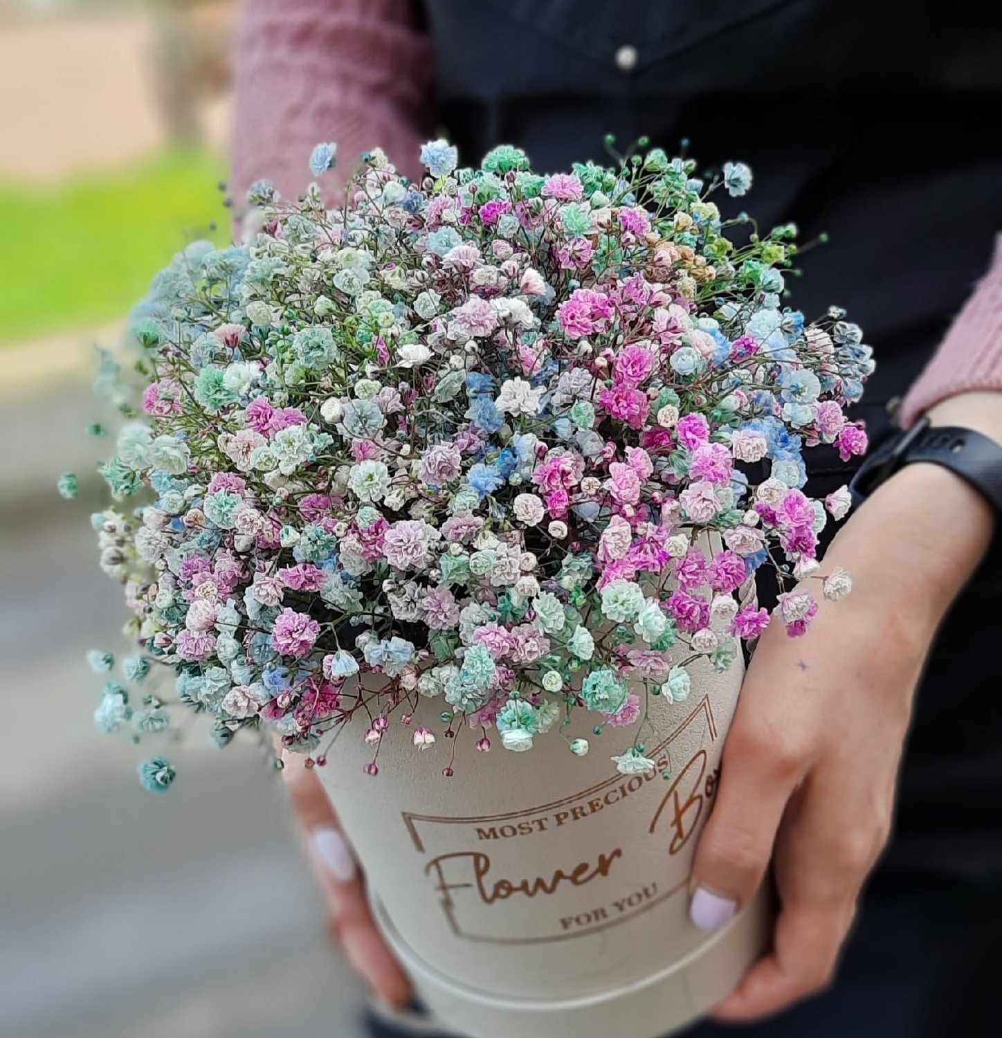 Состав: декоративная коробка, флористическая губка, цветная Гипсофила.
