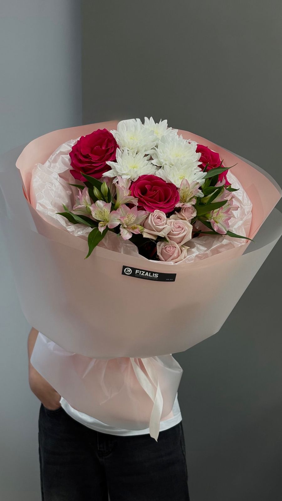 Состав: Роза кустовая, Роза Эквадор, Хризантема кустовая, Альстромерия, упаковка, лента.