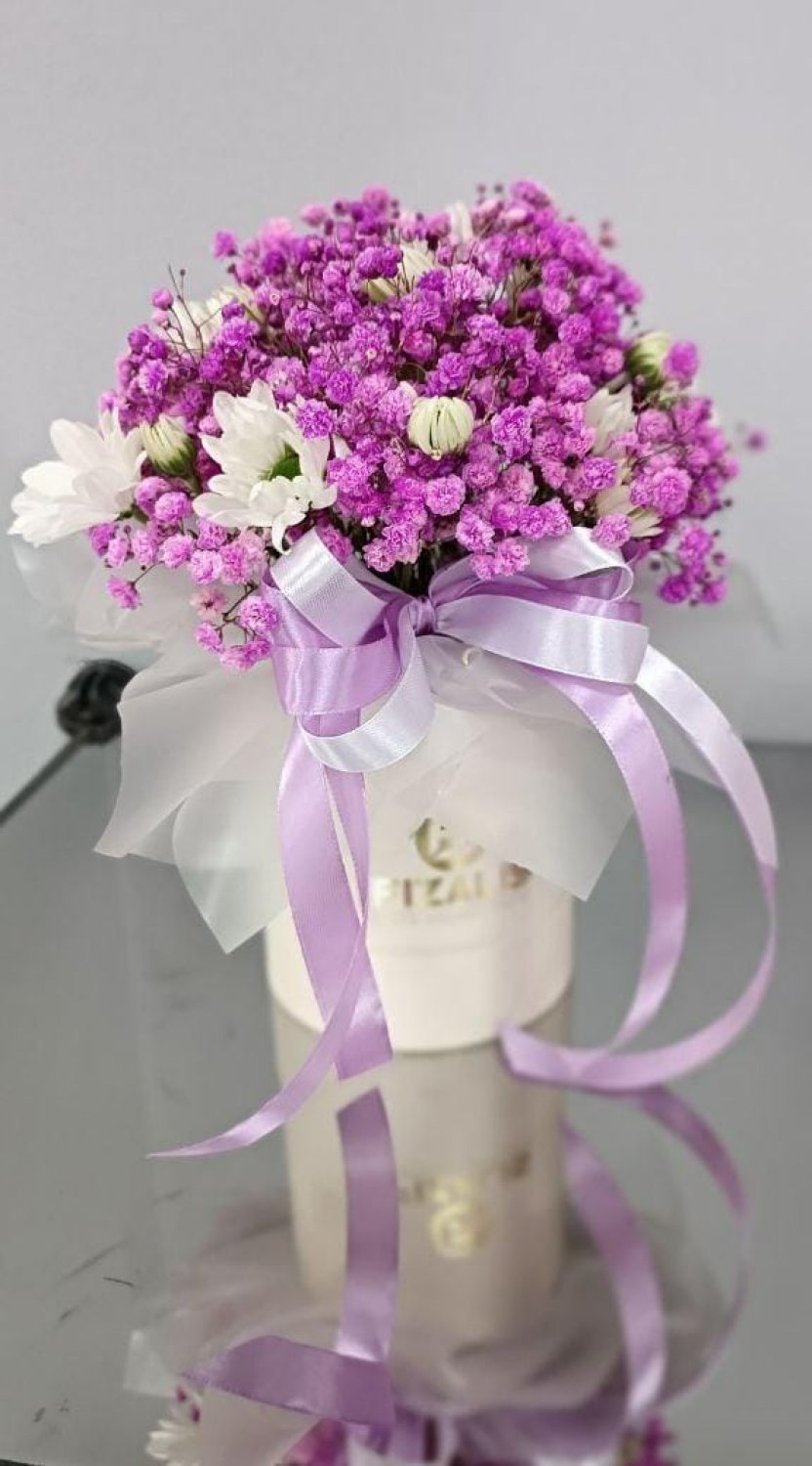 Состав: Гипсофила цветная, Хризантема кустовая, шляпная коробка, флористическая губка.
