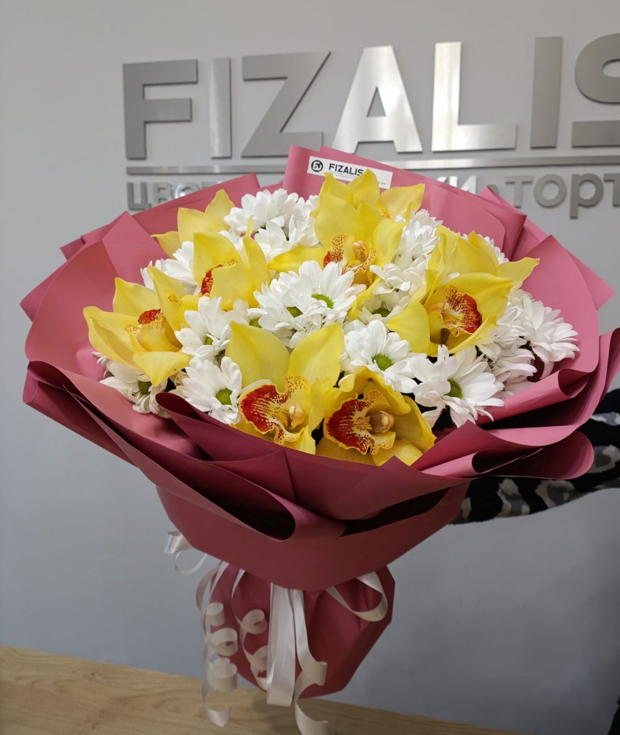 Состав: Хризантема кустовая, Цимбидиум, упаковка, лента.