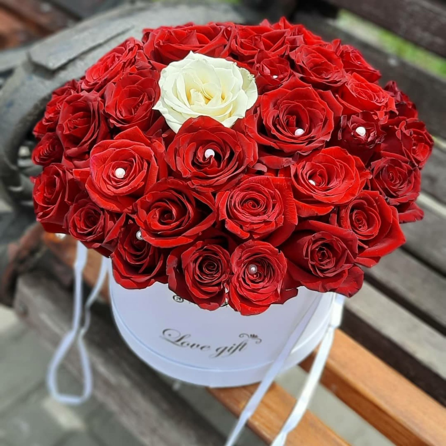 Мы делаем цветочные композиции только в наших брендированных коробках. Также можете добавить брендированную ленту при выборе букета.