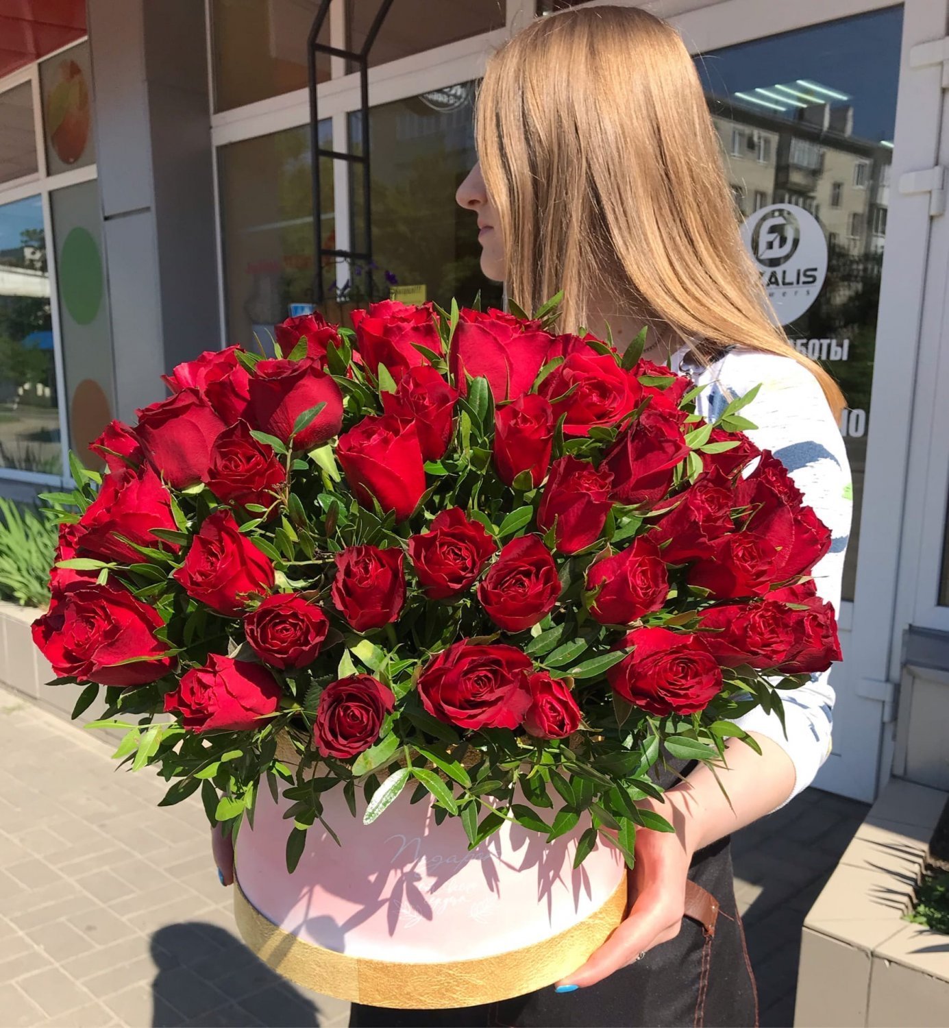 Мы делаем цветочные композиции только в наших брендированных коробках. Также можете добавить брендированную ленту при выборе букета.