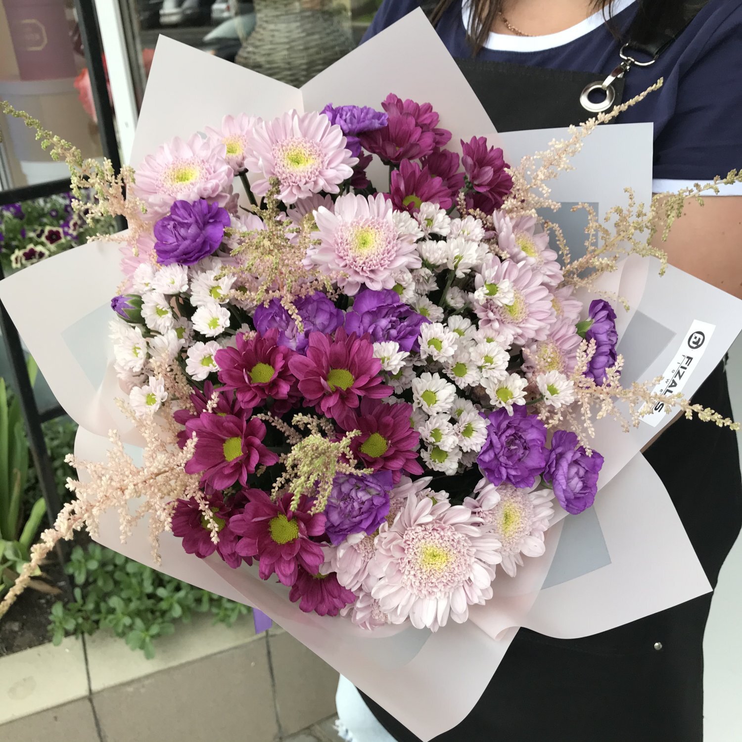 Состав: Хризантема кустовая, Хризантема Сантини, Астильба, Гвоздика кустовая, упаковка, лента.