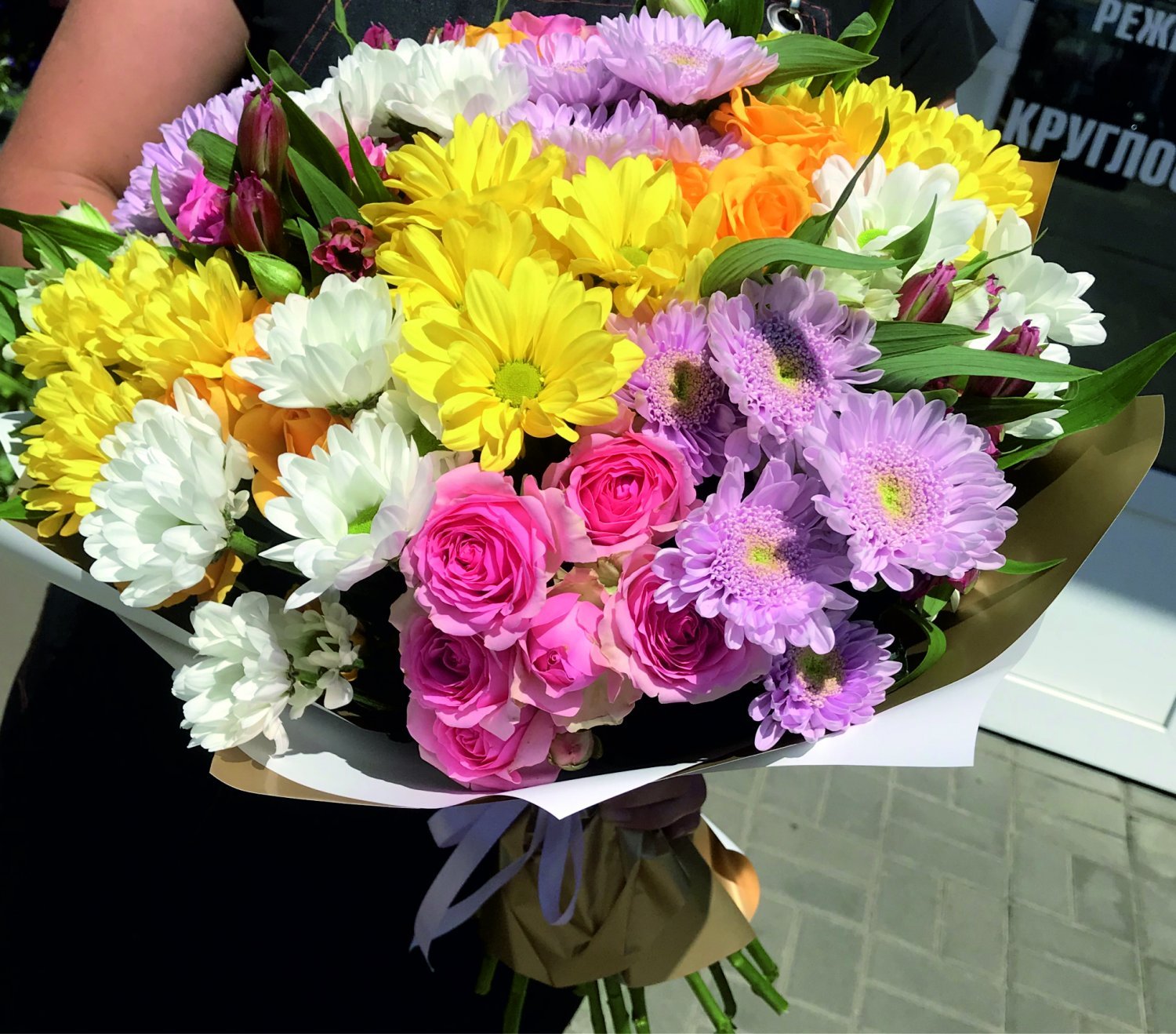 Состав: Хризантема кустовая, Альстромерия, Роза кустовая, упаковка, лента.