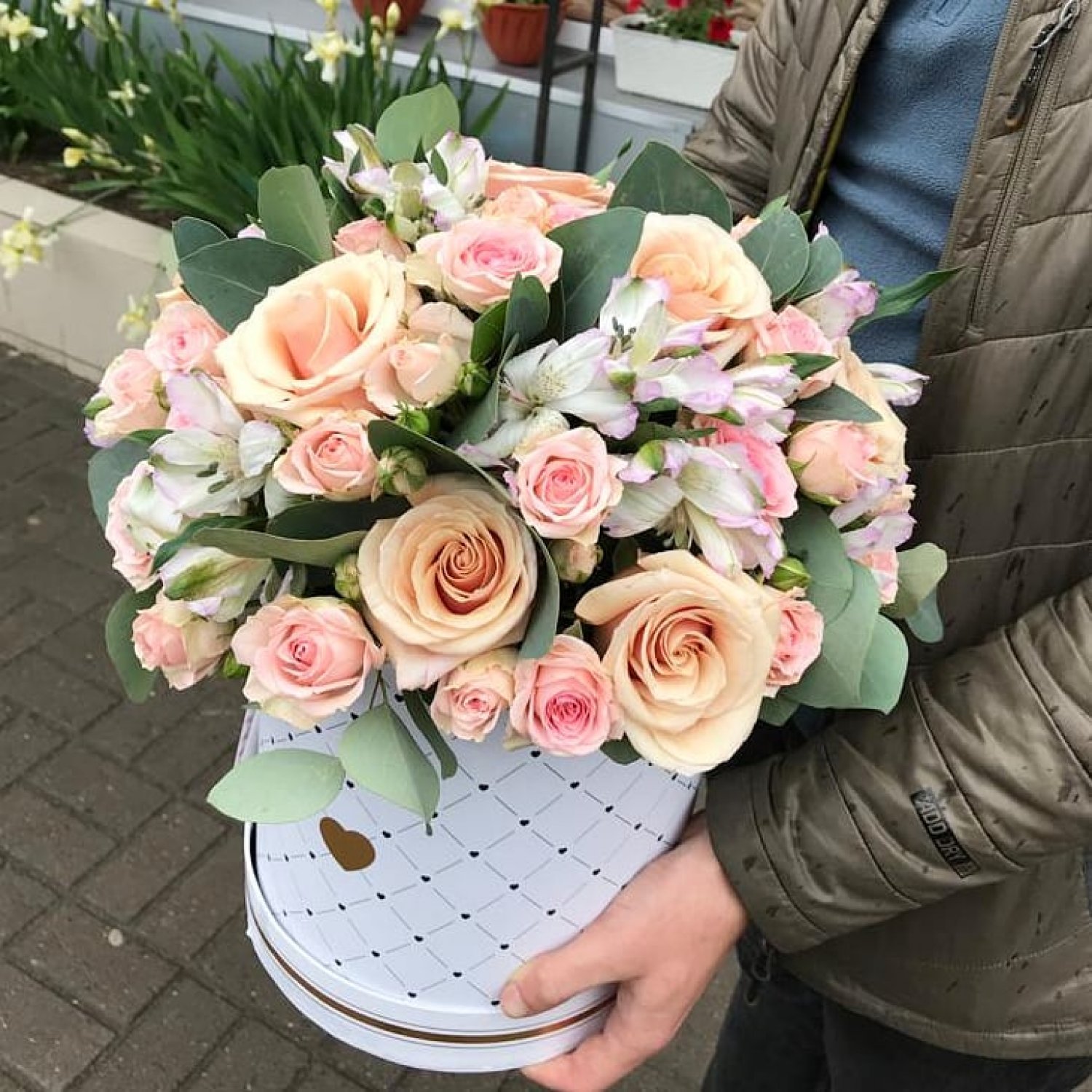 Состав: Роза, кустовая Роза, Альстромерия, Эвкалипт, декоративная коробка, флористическая губка.