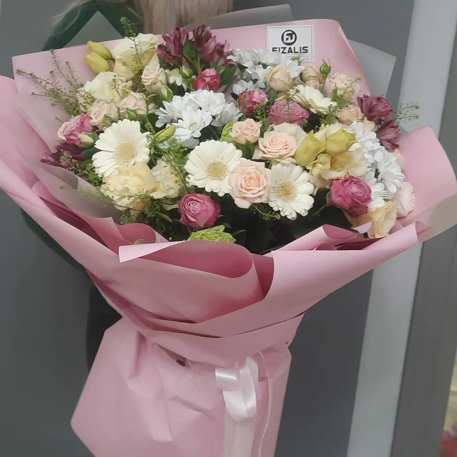 Состав: Хризантема, Альстромерия, кустовая роза, гербера, зелень, упаковка, лента.