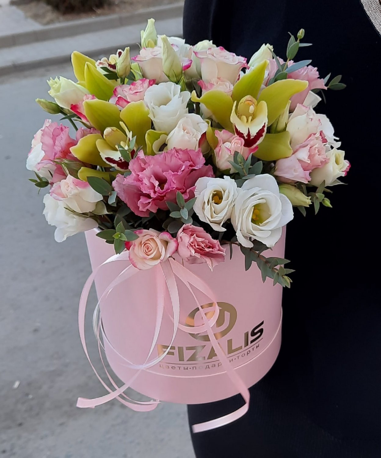 Состав: Лизиантус, Цимбидиум, кустовая Роза, Эвкалипт, флористическая губка, декоративная коробка.