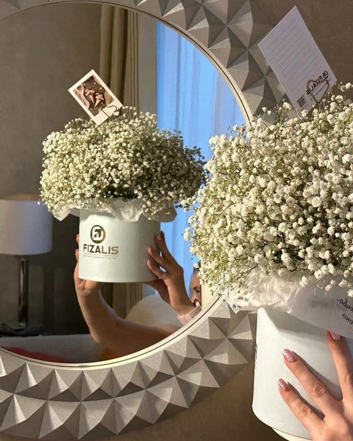 Состав букета: Гипсофила белая, шляпная коробка.