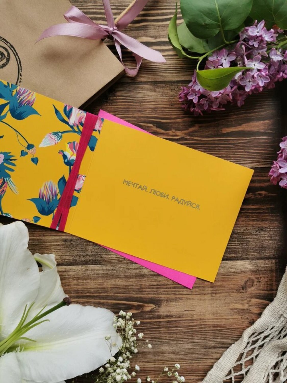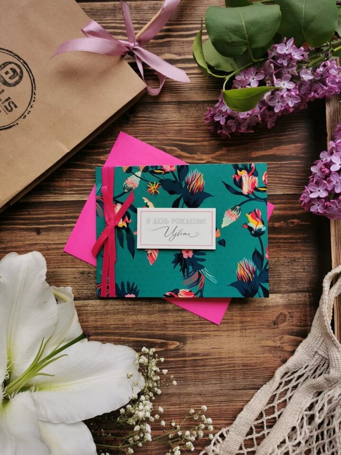 Мы делаем цветочные композиции только в наших брендированных коробках. Также можете добавить брендированную ленту при выборе букета.