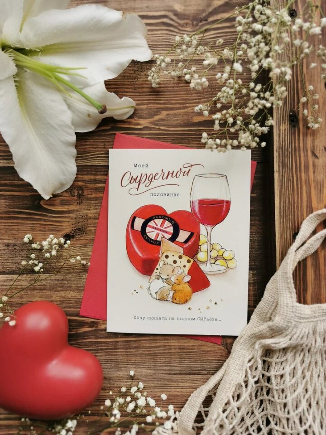 открытка с милым рисунком: две мышки наслаждаются сыром и трогательной надписью «Моей сЫрдечной половинке». Идеальная открытка для любимой человека, чтобы признаться в чувствах с улыбкой. Отлично дополнит букет цветов или станет самостоятельным небольшим подарком, который точно запомнится.