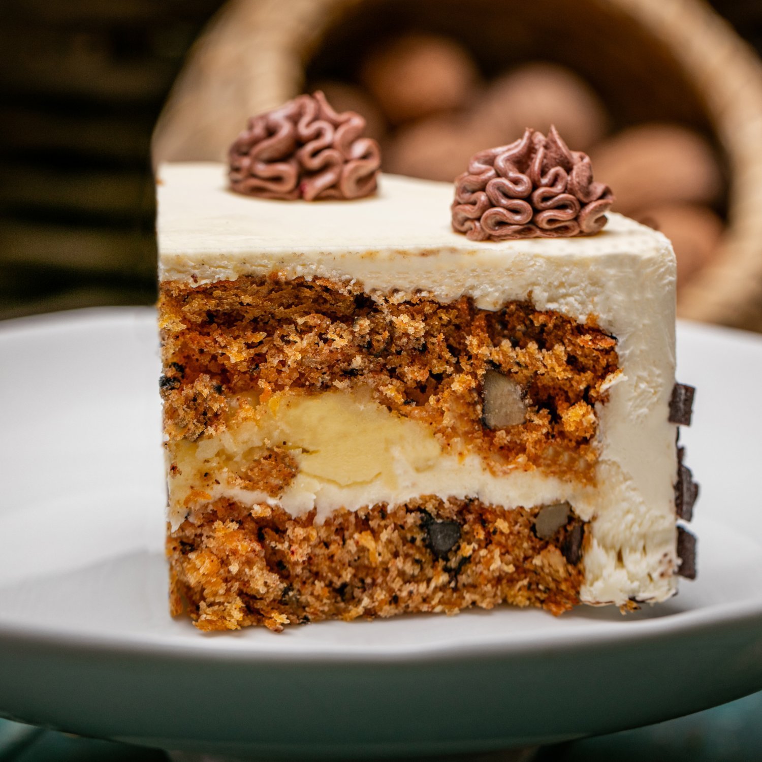 Описание: Морковный бисквит с грецким орехом и апельсиновой прослойкой, крем «Пломбир».