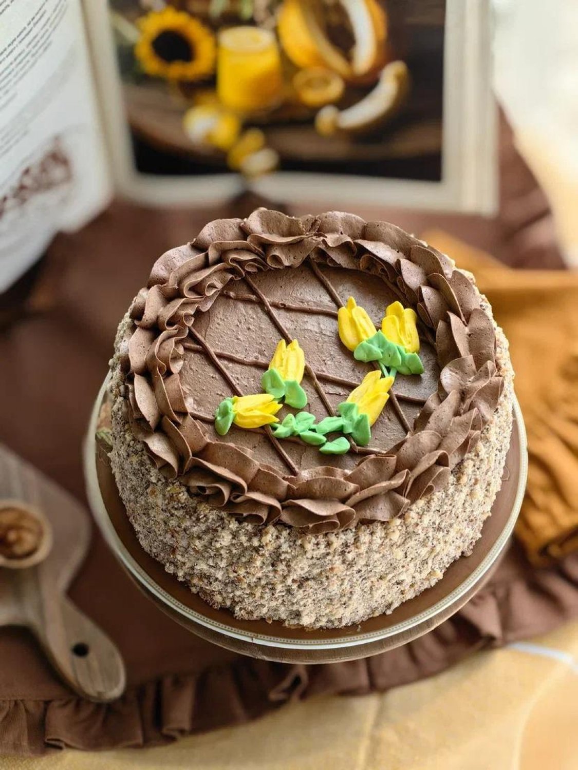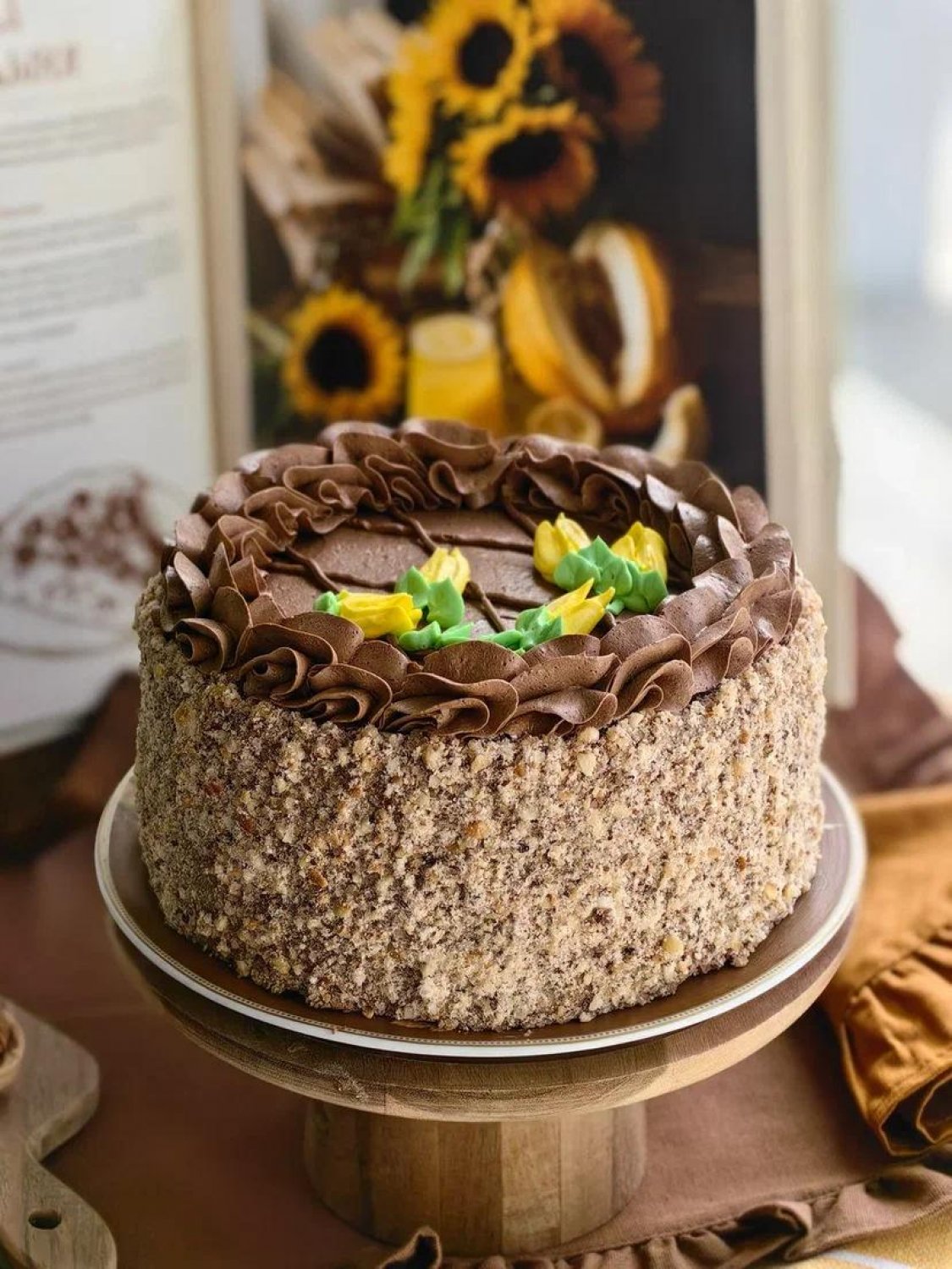 Описание: Воздушно-ореховый бисквит, крем «Шарлотт», крем «Шарлотт» шоколадный, лепестки арахиса.