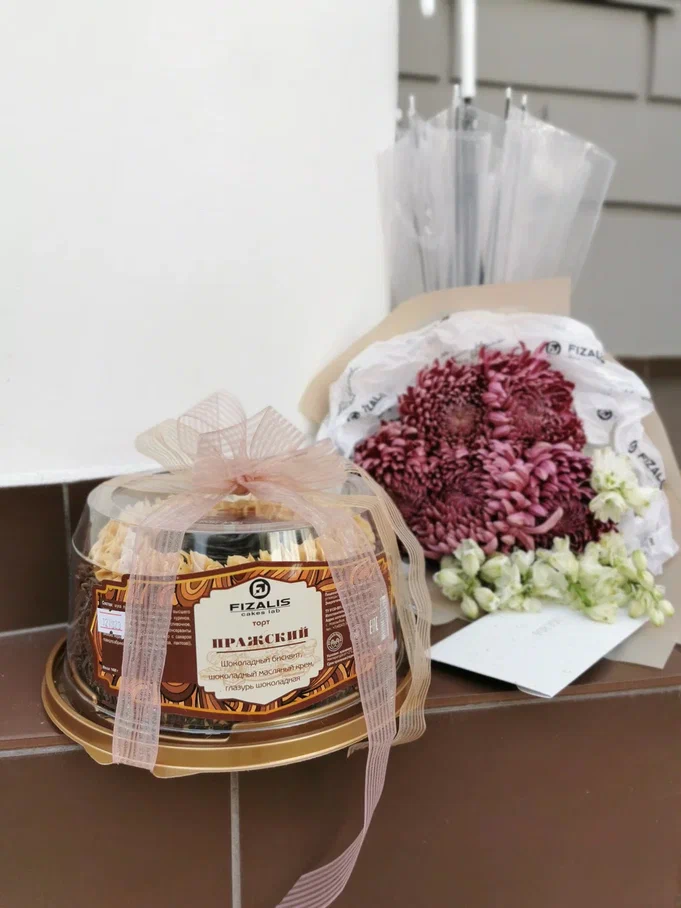 Мы делаем цветочные композиции только в наших брендированных коробках. Также можете добавить брендированную ленту при выборе букета.