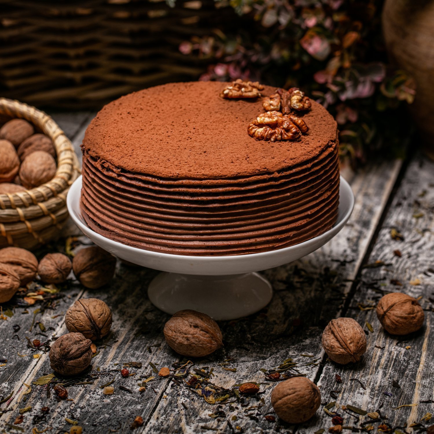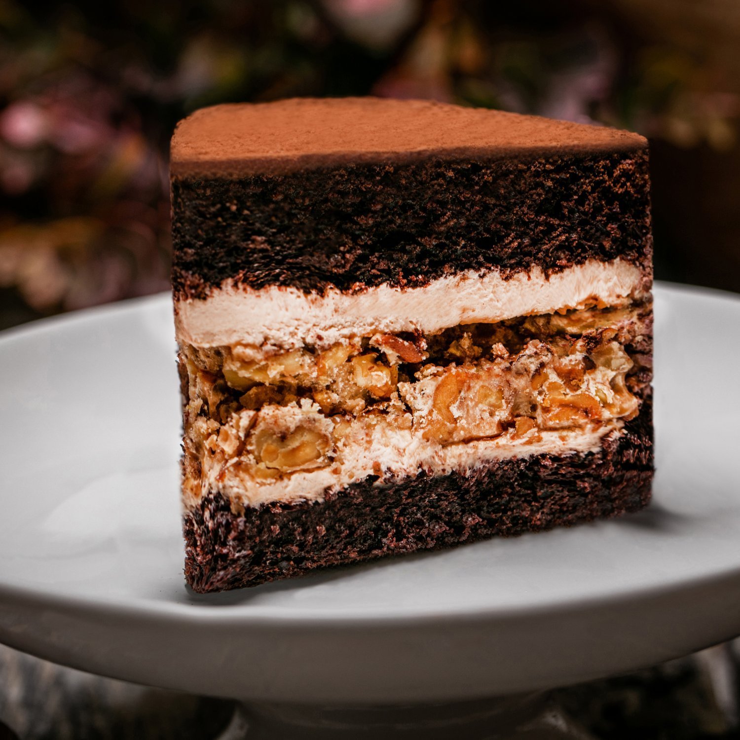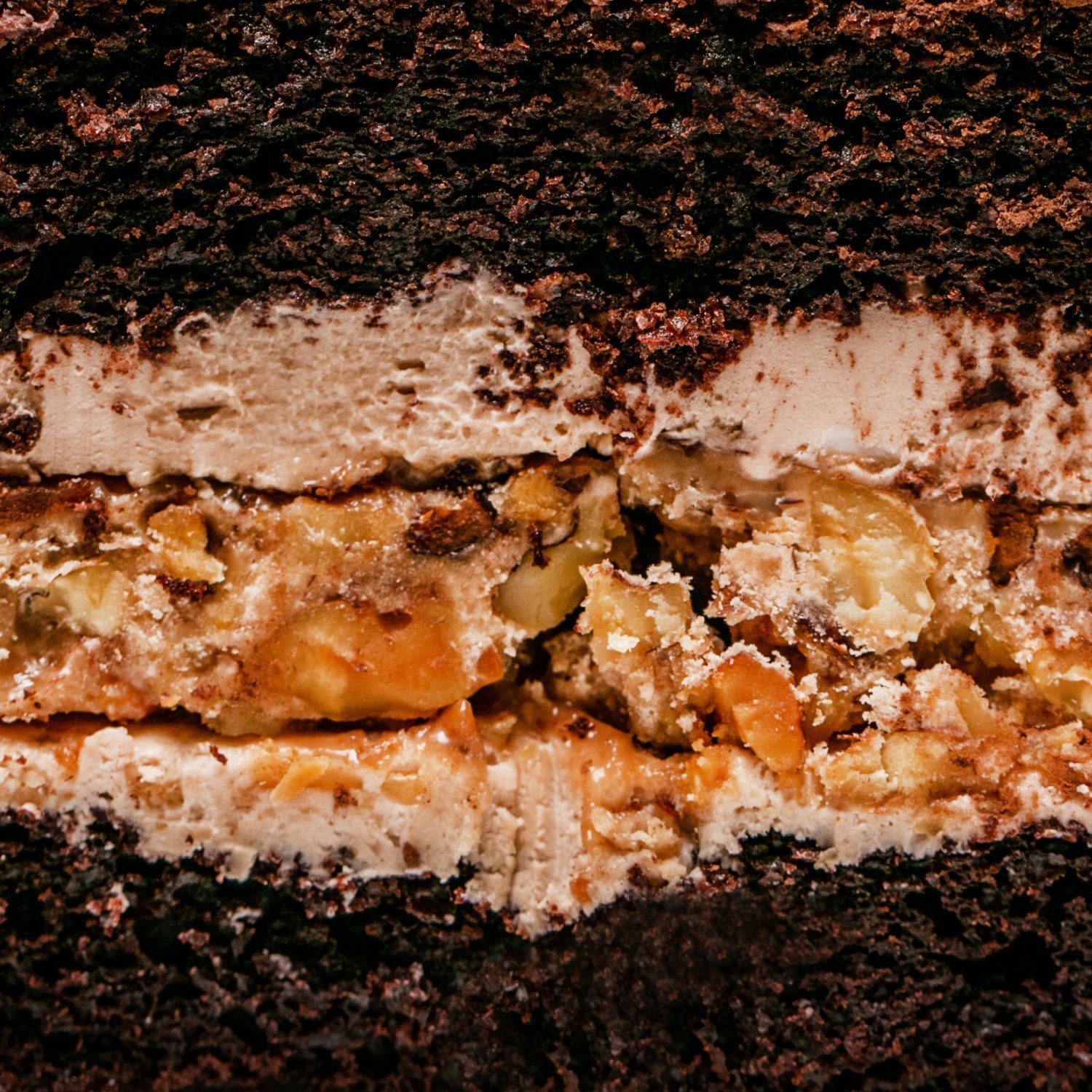 Описание: Шоколадный бисквит на кефире, карамель с грецким орехом, шоколадный крем и темный шоколад.